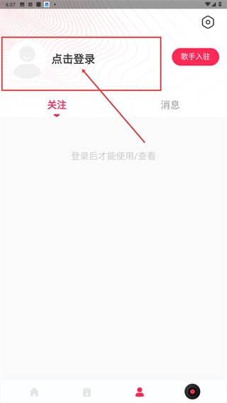2、进入主界面后,点击顶部的【点击登录】区域,即可启动登录流程;完成登录后,就能使用关注、消息等相关功能了。