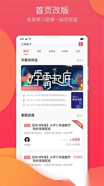 按年级与教材版本划分的同步精讲课程,涵盖重难点微课及考点突破题库;每周更新名校教师直播课,支持实时互动答疑,回放配备智能笔记功能。