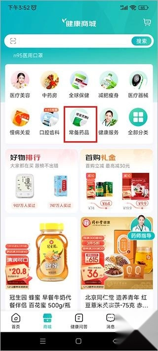1、点击商城中的常备药品,也可以直接搜索买药;