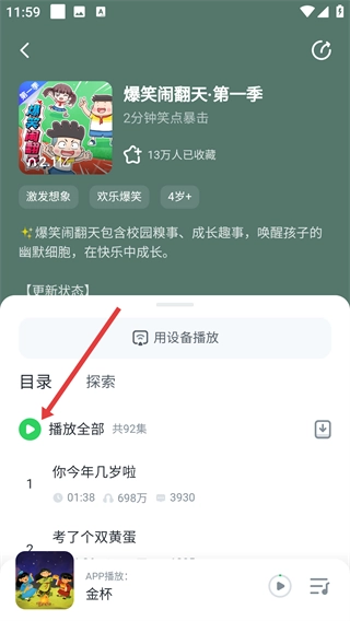 进入《爆笑闹翻天·第一季》的详情页面后,点击“播放全部”按钮,就可以开始收听这个系列的故事,尽情享受欢乐时光啦。