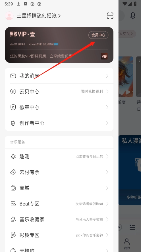 在菜单页面,点击会员中心。