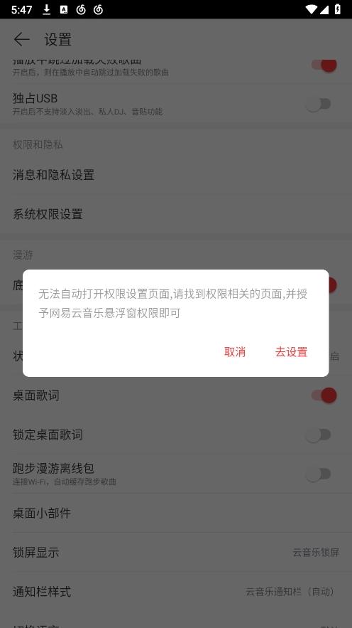 开启煮面歌词功能后,系统会请求悬浮窗权限,进行相应设置即可使用。