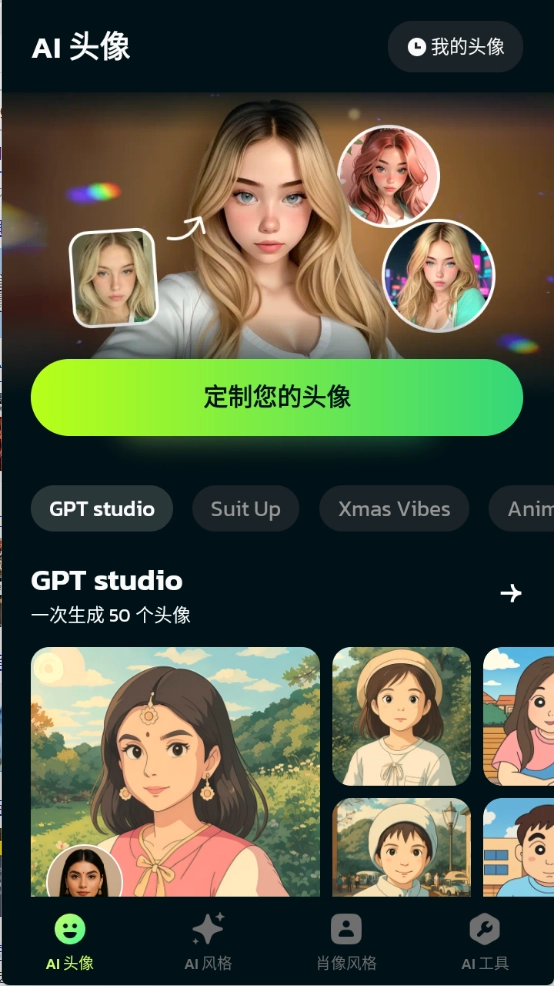 首页底部栏有AI头像、AI风格以及肖像风格等。