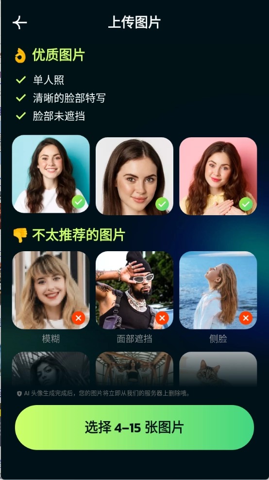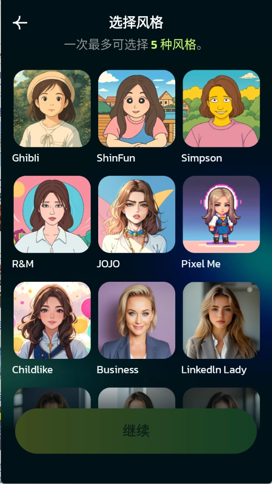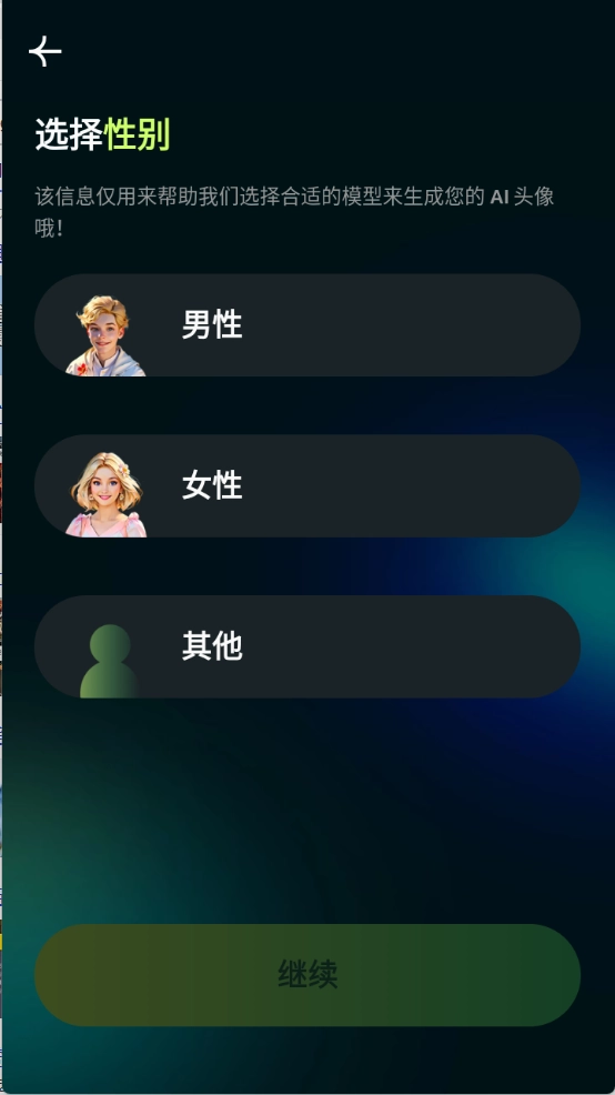 用户挑选自己喜爱的板块,我这边就拿AI头像来举例,选定性别后点击继续。