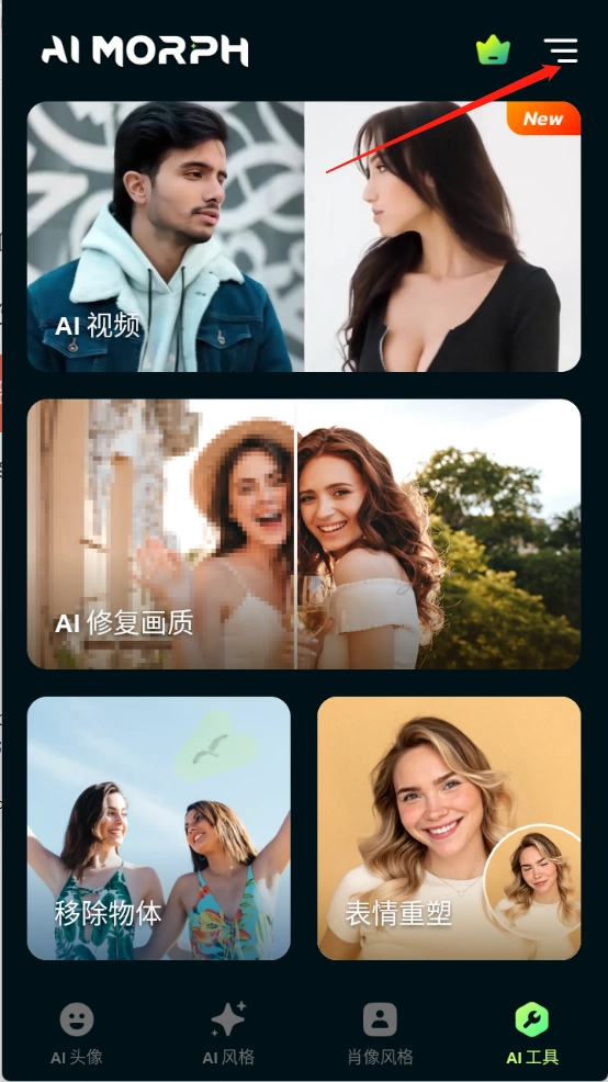 进入首页后,在“AI工具”页面点击右上角的标志。
