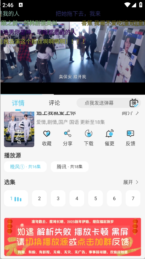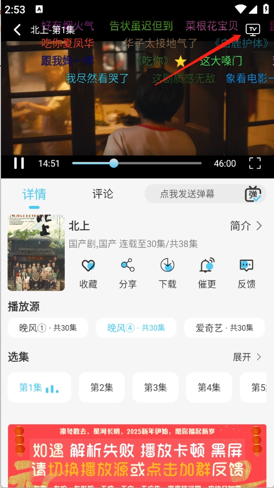 找到并打开想看的影片后,就能开始播放影视内容了,还可以观看弹幕、切换播放源。