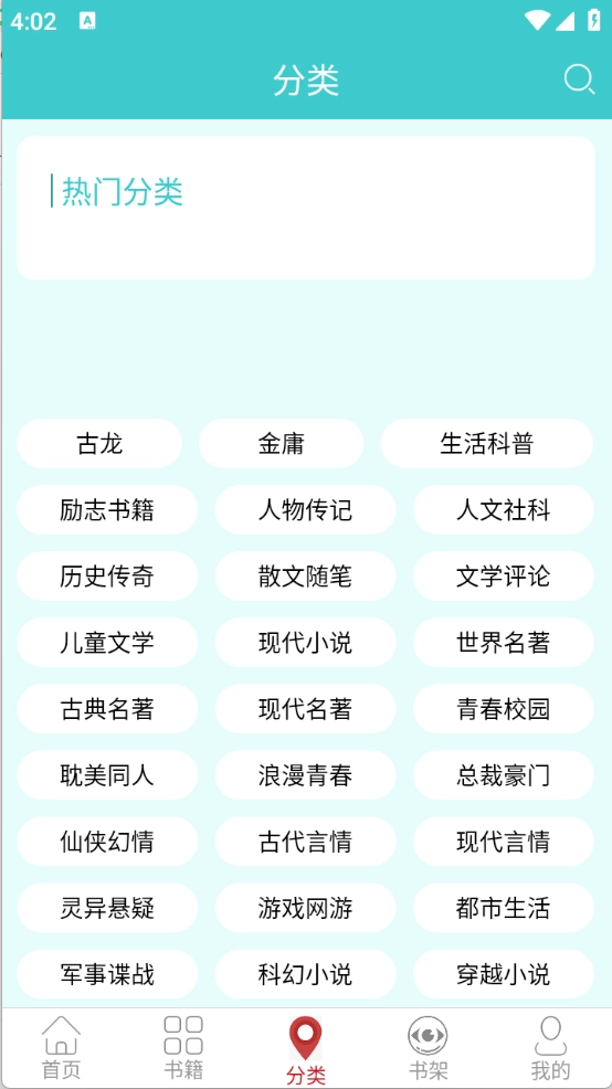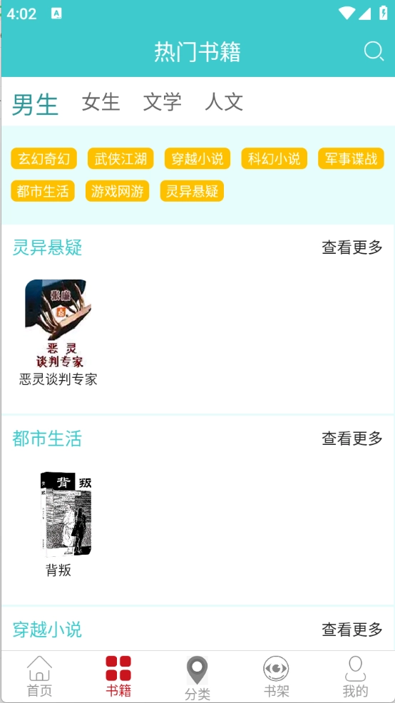 “书籍”与“分类”页面对小说做了细致的归类,文学、人文、仙侠等各类题材均有涵盖。