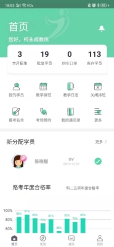 每个学员都拥有完整的学员档案,教练可随时查看科一到科四的学习情况,更有一键拨打电话与一键发送消息功能。