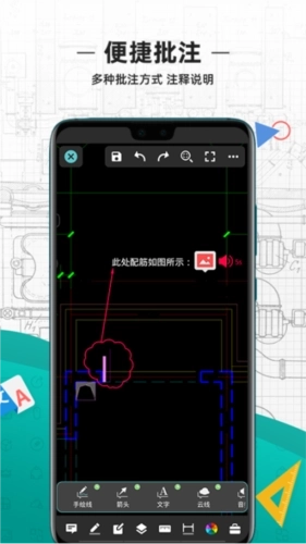 4.CAD批注功能支持语音、照片、文字等多种形式的批注添加,还能将批注内容分享给好友,助力团队协同工作。