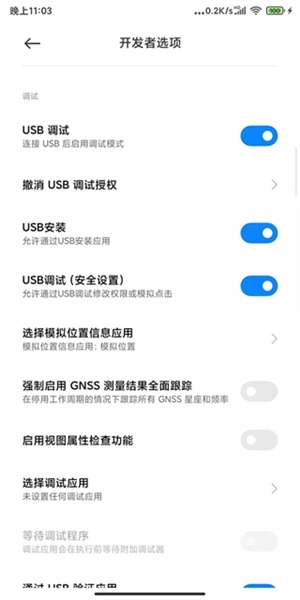 4、在开发者模式设置中可以找到USB调试并开启;