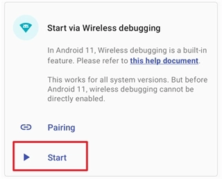 通过无线调试可启动适配Android11及更高版本的设备,该方式无需连接电脑。但受系统限制,设备每次重启后都需重新执行启动操作。